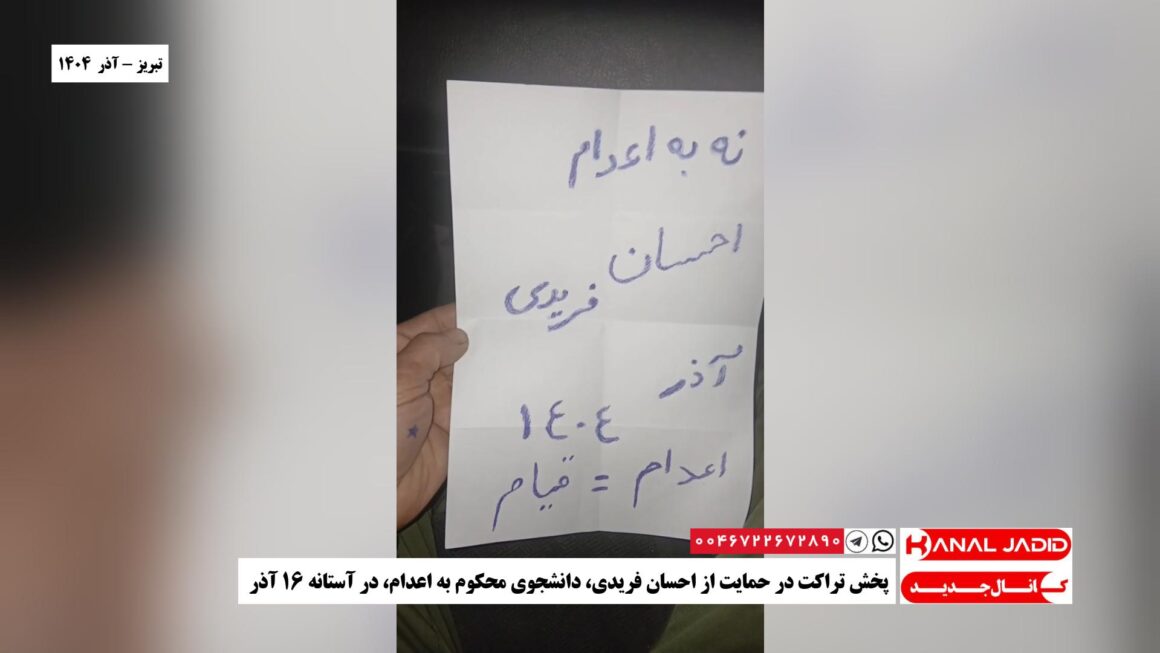 کلیپ روز دسامبر 3, 2025 Aghil تبریز – پخش تراکت در حمایت از احسان فریدی، دانشجوی محکوم به اعدام، در آستانه ۱۶ آذر